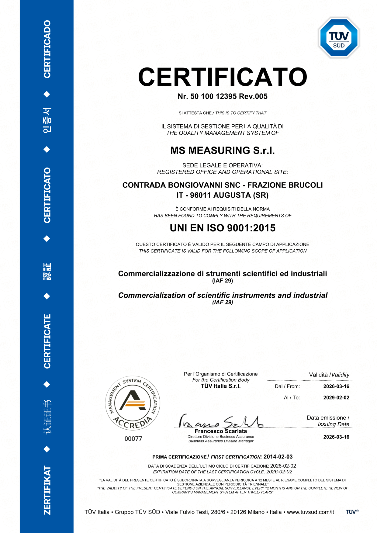 La MS Measuring è azienda certificata ISO 9001:2015, i cui flussi di lavoro sono sottoposti a periodici controlli di qualità da parte di TÜV.